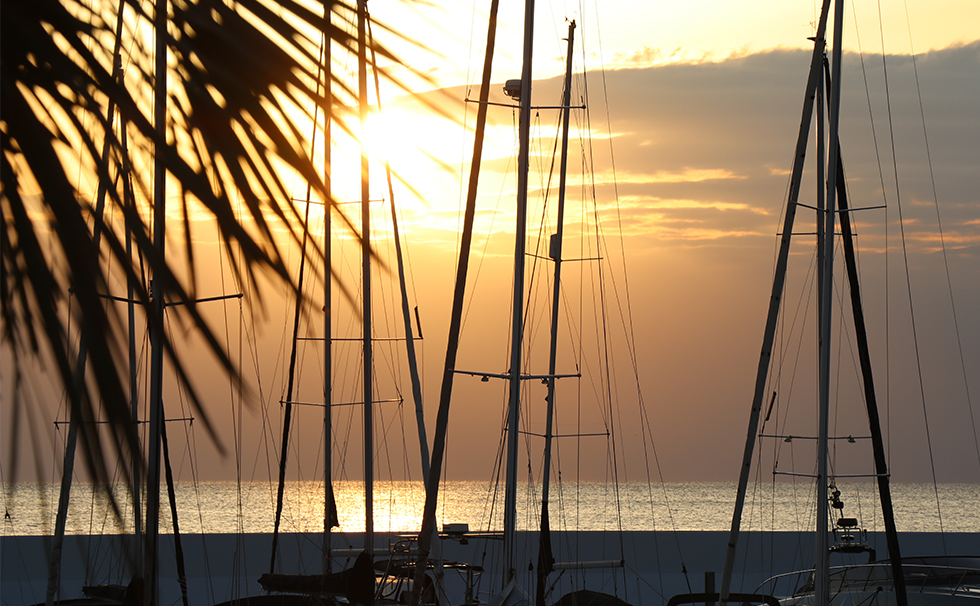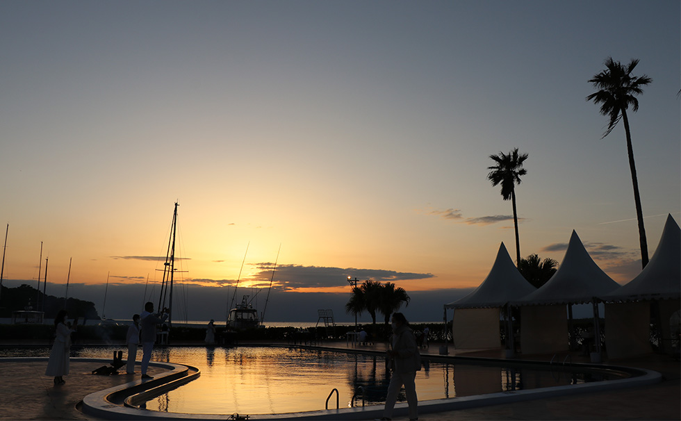 マリーナ越しの海に沈むサンセットに富士山が浮かび上がる、リビエラシーボニアマリーナの中でも特別なプールサイド。