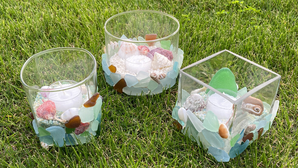 小網代湾のビーチクリーンで採れたシーグラスを使ったキャンドルホルダーづくり。自然が作り出したパワーストーンです。きれいに磨いて再利用することでSDGsにも配慮。
