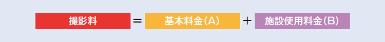 - 撮影料金は、「基本料金」と「施設使用料金」を足したものとします。
