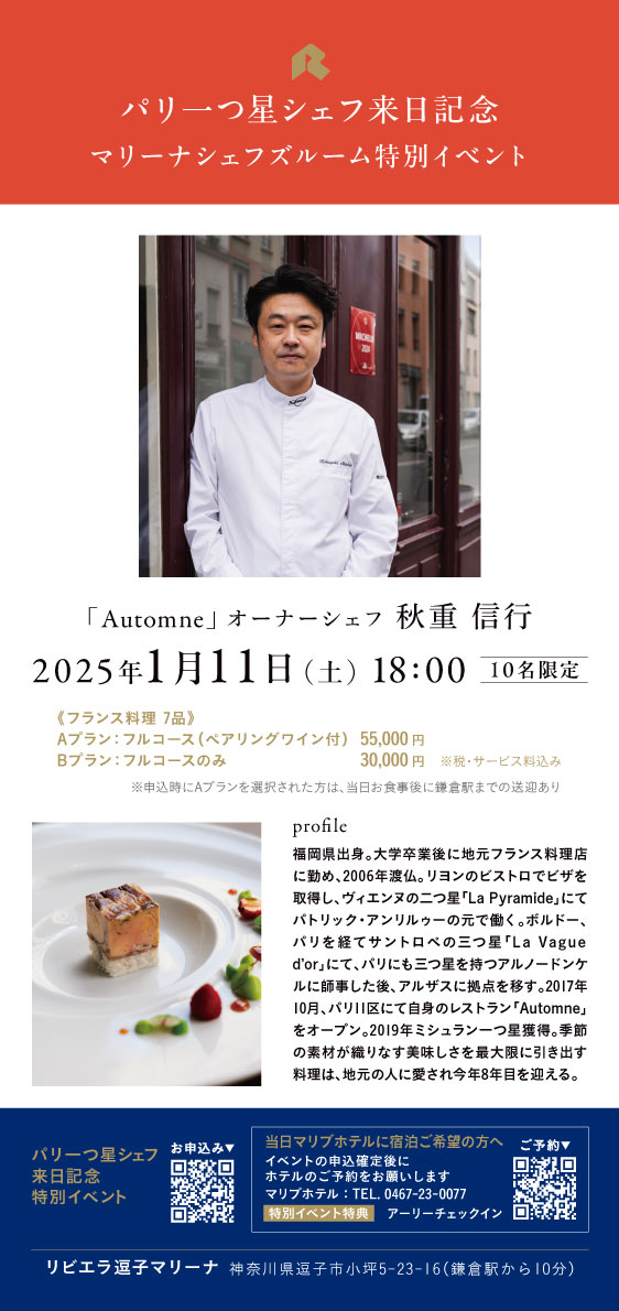 パリの美食家たちを魅了し続ける「Automne」の真髄をパリに行かずとも味わえるこの貴重な機会。さらに、湘南の新鮮な食材を活かした、この日限りの特別メニューとワインとのマリアージュを、秋重シェフを独り占めできるリビエラ逗子マリーナの特別な空間で、至福のひとときを心ゆくまでご堪能ください。