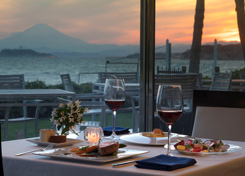 オーシャンビューの店内から、富士山と江の島、そして幻想的なサンセットを望むモダンイタリアン。シェフ渾身のスペシャルフルコースディナーとともに、花火を優雅にお楽しみください。