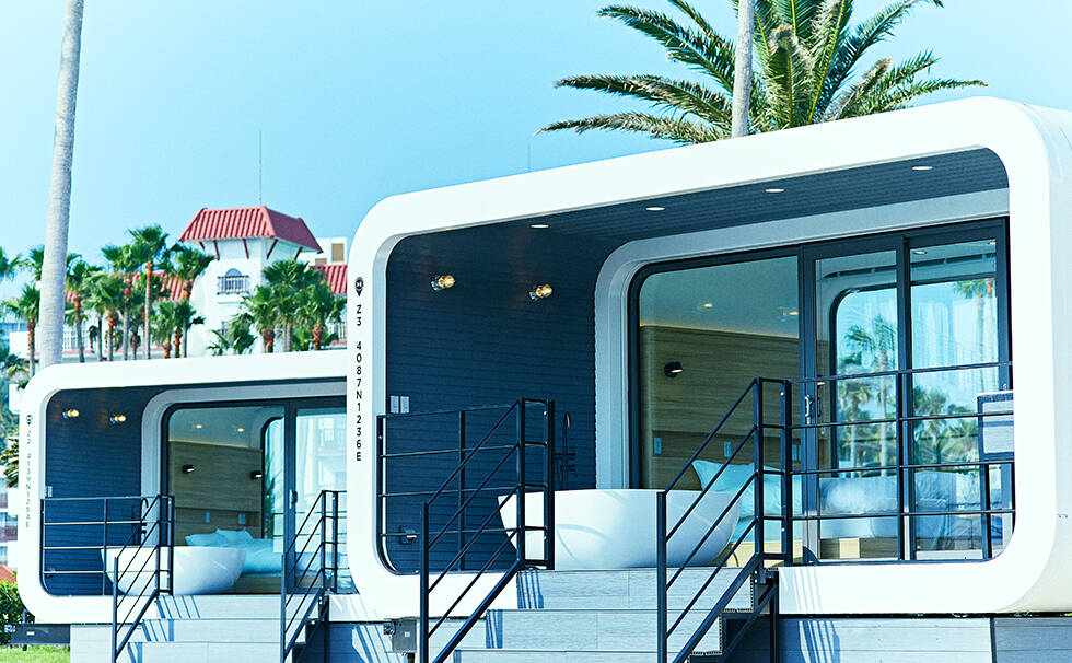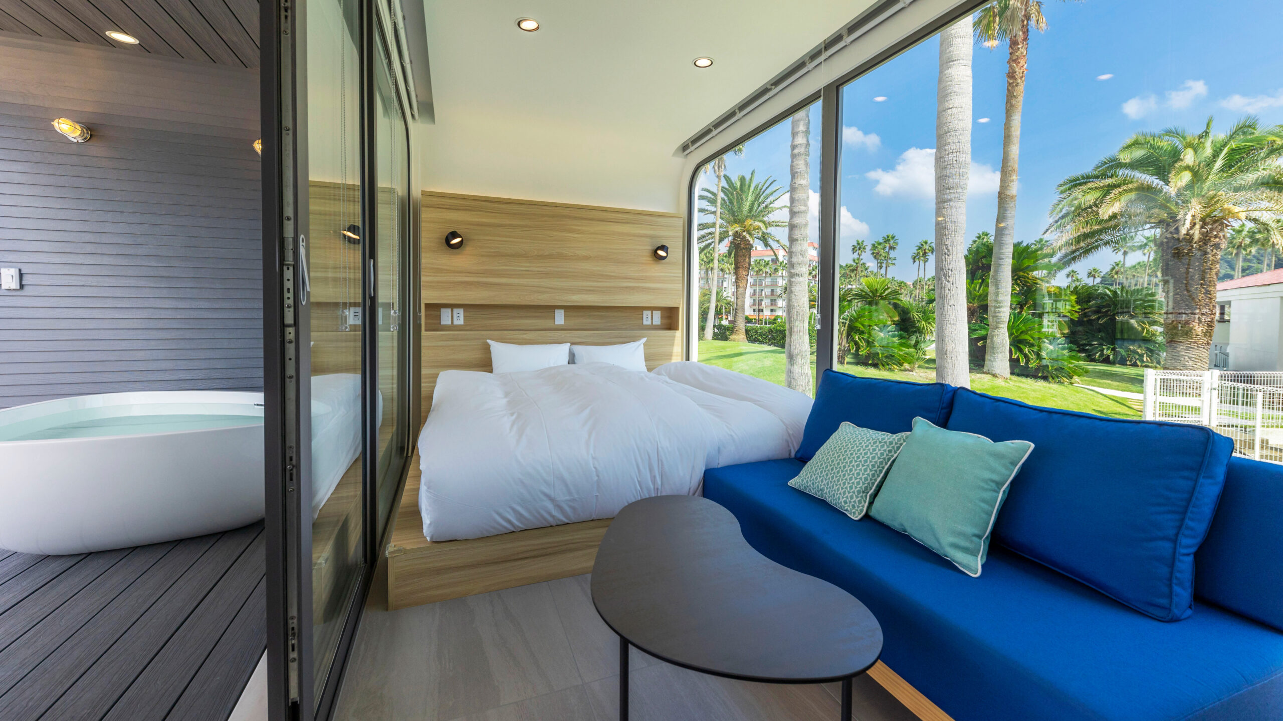開放感ある一面のガラスに、そよぐ潮風を楽しむ広いテラスを有する客室は、オーシャンビューの好立地を存分に楽しむための日本初の新たなデザイン。