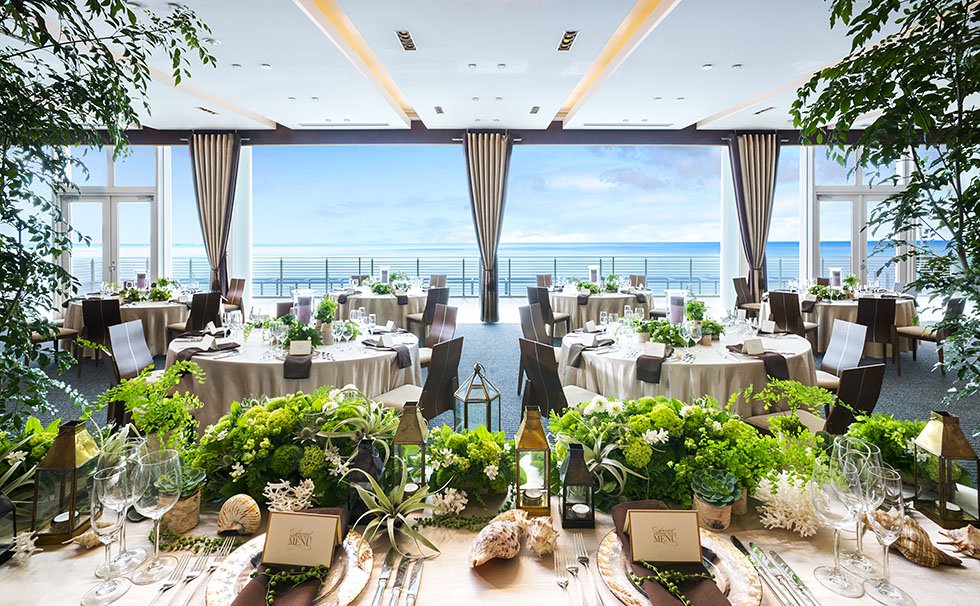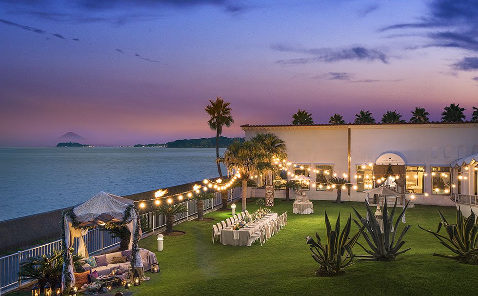 レストランの隣の海に臨んだパーティ会場「アクアガーデン」。会場から続く緑豊かなプライベートガーデンでは、燦々と降り注ぐ太陽と潮風に包まれたガーデンパーティも素敵に映えます。煙めく朝日やオレンジ色のサンセットに染まりゆく海の表情までも楽しめる、三方を海に囲まれた賛沢な撮影スポットです。