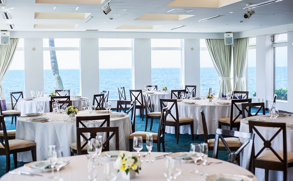 輝く海を270度も見渡せる、絶景の独立型チャペル。ガラスと白木で造られた明るい空間に、眩しいほどの自然光が降りそそぎます。マリーナ内でも最も海にせり出している一角にあるため、まるで人物が海に浮かんでいるようなシーンを演出することができます。すべてが黄金色の夕陽に染まるサンセットタイムは息をのむ美しさ。