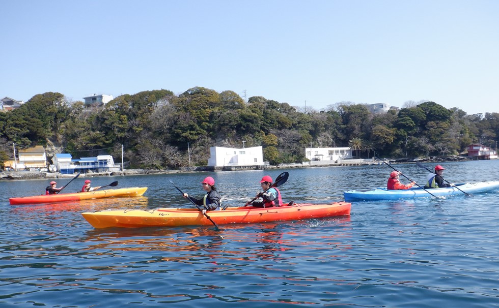 小学生でも安心して乗れるシーカヤックを使用。2名ペアで息を合わせてパドルを動かしカヤックを進めます。