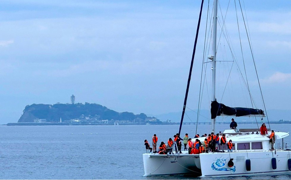穏やかな小網代湾をボートに乗りクルージング。小網代の森や地形を海から見て、環境を学びます。