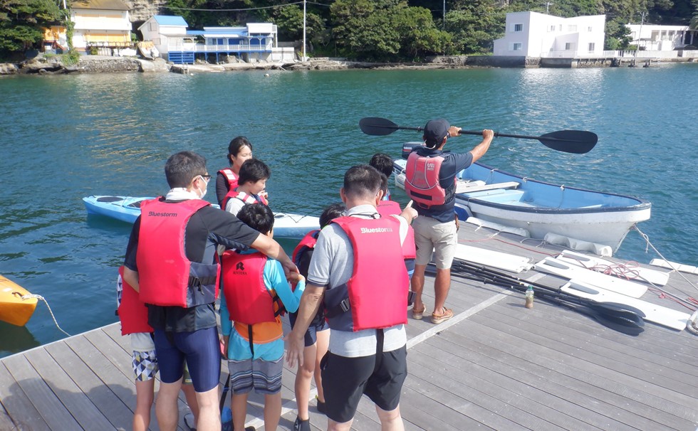 小学生でも安心して乗れるシーカヤックを使用。2名ペアで息を合わせてパドルを動かしカヤックを進めます。